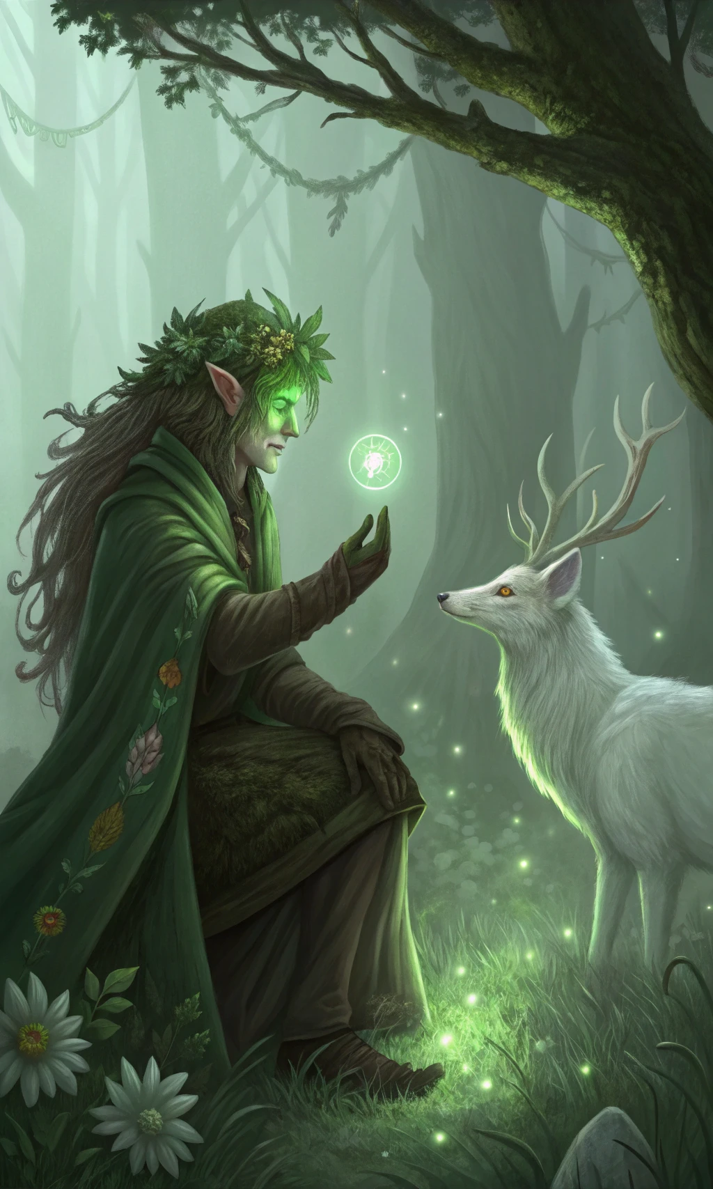 Whispering secrets from an enchanted vale, this isn't your average fantasy character. You get a fully-formed being with ageless, moss-textured skin and robes woven from living leaves that change with the seasons. The prompt pack includes details like kneeling in a misty clearing with a glowing white stag companion, whispering to flowers with emerald-lit hands—perfect for generating unique art of serene, nature-bound scenes and their mystical companions.